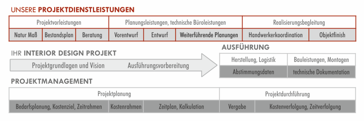 Kreative Gestaltungsarbeit, Beratung, Vorentwurf, Entwurf, Präsentation, Produktentwicklung ( ev. Realisierungsstudie mit Analyse & Befund, Workshops,…). Die Gestaltungsarbeit wird auf der technischen Grundlagenermittlung (Bau-Projektteam), der Bedarfsplanung sowie dem Raum & Funktionsprogramms (Projektmanagement) aufgebaut. Der Entwurf wird verstärkt in Abstimmung mit der CI und dem CD eines Unternehmens entwickelt. Umsetzungsplanungen wie Einreichplanung, Ausführungsplanung, Detailplanung und Ausführungsbeschreibungen als ausschreibungsfähige Unterlagen oder eine vereinfachte Umsetzungsplanung und Positionsbeschreibung in Absprache mit dem Bau- Projektteam.